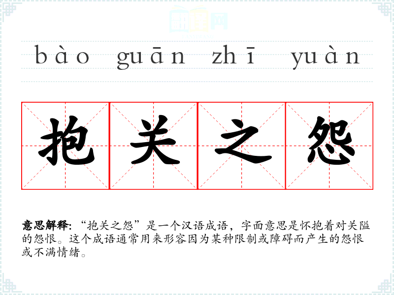 “抱关之怨”是一个汉语成语,字面意思是怀抱着对关隘的怨恨。这个成语通常用来形容因为某种限制或障碍而产生的怨恨或不满情绪。