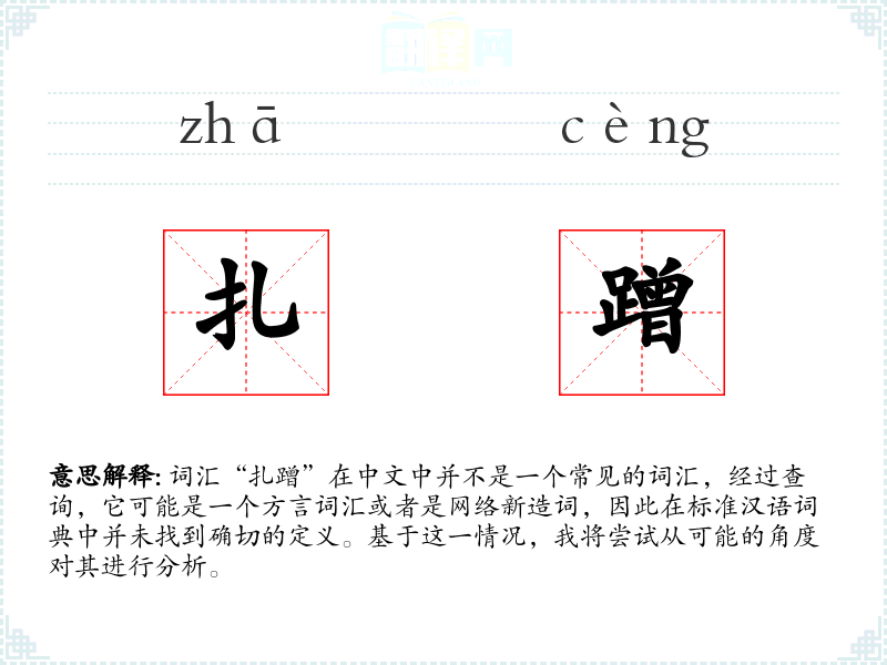 由于“扎蹭”不是一个标准词汇,我们无法给出确切的字面意思和基本含义。它可能是某个地区方言中的词汇,或者是网络用语,具体含义需要结合具体语境来理解。