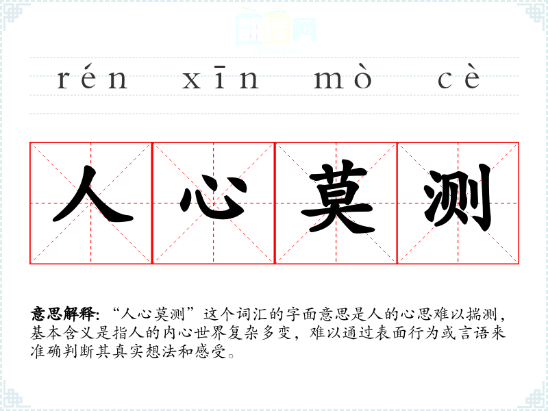 “人心莫测”这个词汇的字面意思是人的心思难以揣测,基本含义是指人的内心世界复杂多变,难以通过表面行为或言语来准确判断其真实想法和感受。