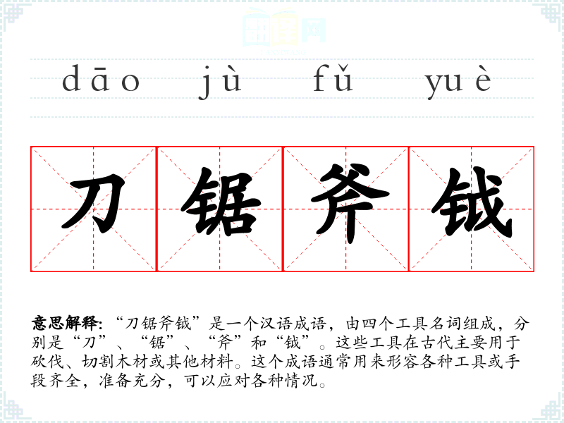 在文学作品中,“刀锯斧钺”常用来形容一个人或集体准备充分,工具齐全,能够应对各种挑战。在口语中,这个成语可能不常用,但在某些特定的专业领域,如木工或建筑行业,可能会提及这些工具的具体用途。