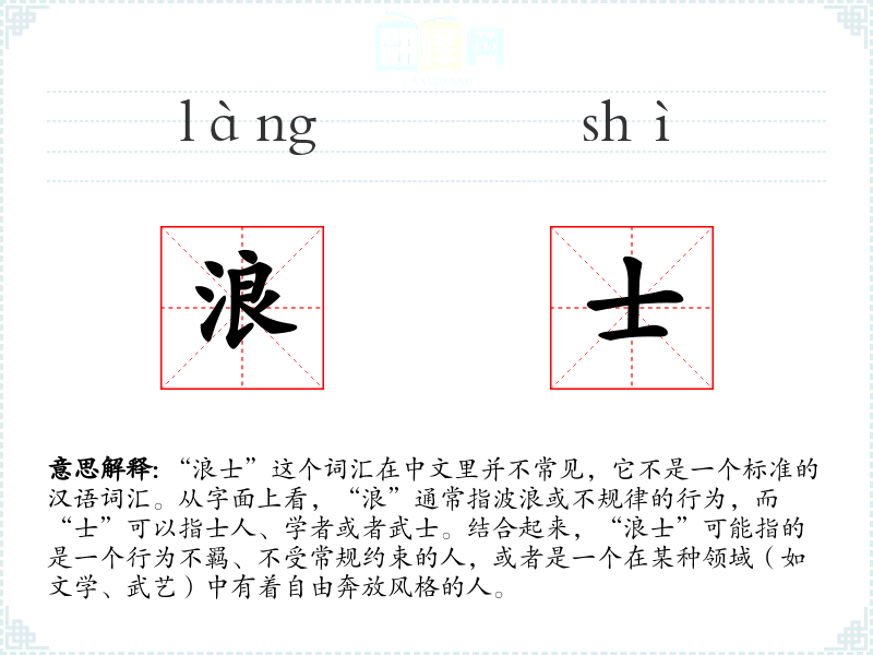 “浪士”这个词汇在中文里并不常见,它不是一个标准的汉语词汇。从字面上看,“浪”通常指波浪或不规律的行为,而“士”可以指士人、学者或者武士。结合起来,“浪士”可能指的是一个行为不羁、不受常规约束的人,或者是一个在某种领域(如文学、武艺)中有着自由奔放风格的人。