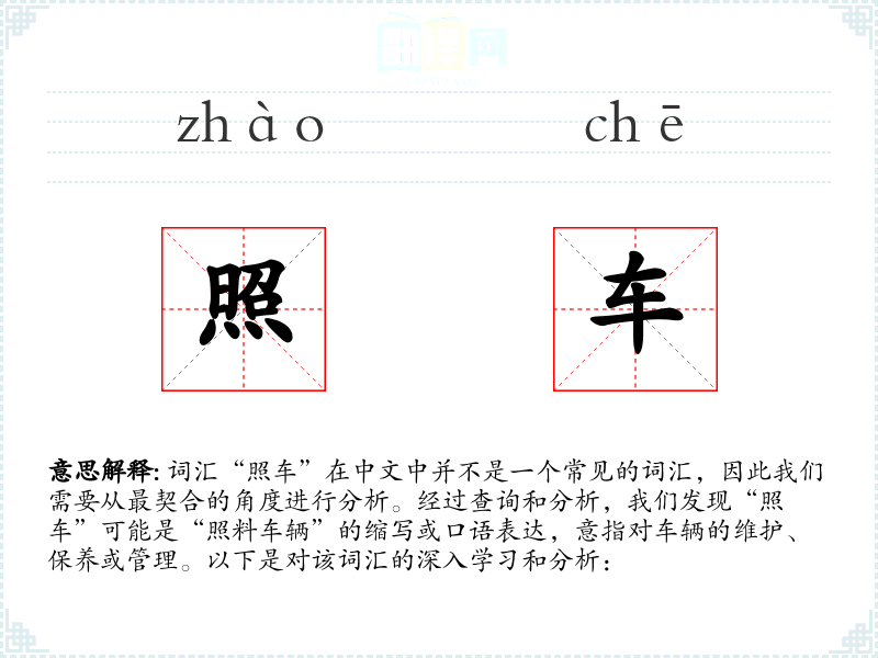 词汇“照车”在中文中并不是一个常见的词汇,因此我们需要从最契合的角度进行分析。经过查询和分析,我们发现“照车”可能是“照料车辆”的缩写或口语表达,意指对车辆的维护、保养或管理。以下是对该词汇的深入学习和分析: