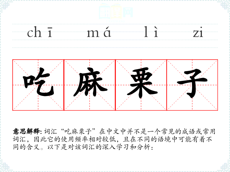 词汇“吃麻栗子”在中文中并不是一个常见的成语或常用词汇,因此它的使用频率相对较低,且在不同的语境中可能有着不同的含义。以下是对该词汇的深入学习和分析: