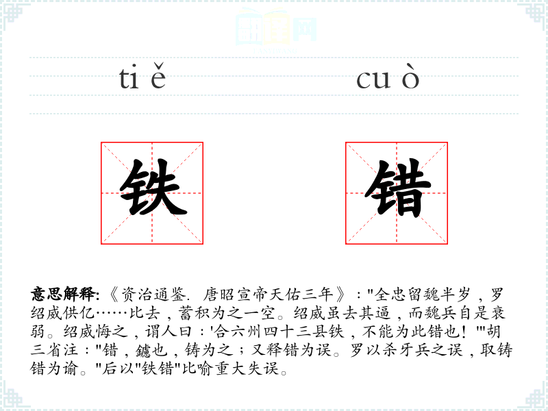 1.《资治通鉴.唐昭宣帝天佑三年》﹕"全忠留魏半岁﹐罗绍威供亿……比去﹐蓄积为之一空。绍威虽去其逼﹐而魏兵自是衰弱。绍威悔之﹐谓人曰﹕'合六州四十三县铁﹐不能为此错也!'"胡三省注﹕"错﹐鑢也﹐铸为之﹔又释错为误。罗以杀牙兵之误﹐取铸错为谕。"后以"铁错"比喻重大失误。