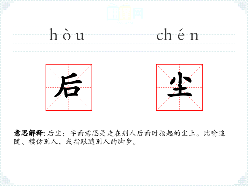 后尘:字面意思是走在别人后面时扬起的尘土。比喻追随、模仿别人,或指跟随别人的脚步。