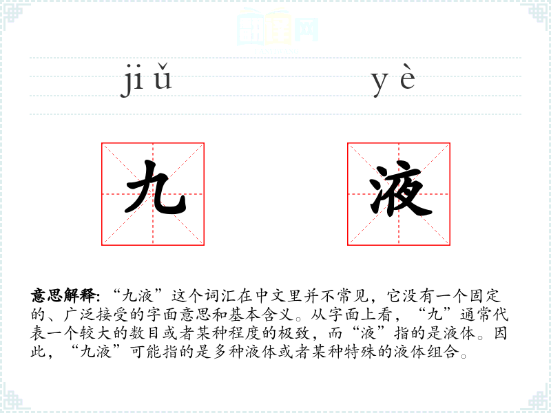 “九液”这个词汇在中文中并不常见,它的使用非常有限,更多是特定语境或文化背景下的产物。对于语言学习者来说,了解这样的词汇可以增加对特定文化或文学作品的理解,但在日常表达中并不常用。
