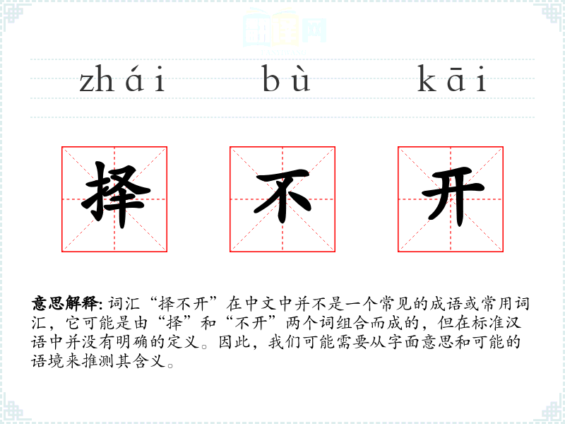 “择”通常意味着选择或挑选,而“不开”可能指的是无法打开或无法解决。结合起来,“择不开”可能意味着无法做出选择或无法解决问题。