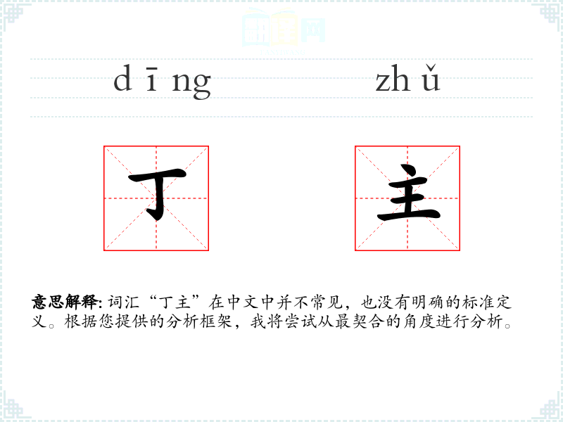由于“丁主”不是一个标准词汇,我们无法提供一个确切的字面意思和基本含义。它可能是某个特定领域或方言中的术语,或者是某个特定社群中的俚语。