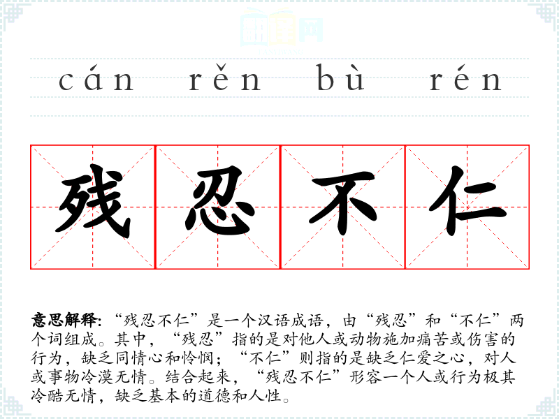 “残忍”一词源于古代汉语,最初可能与“残”(残缺、残害)和“忍”(忍受、忍耐)有关,后来逐渐演变为形容词,表示行为上的残酷。“不仁”则源于儒家思想中的“仁”,即仁爱之心,不仁即缺乏这种道德品质。