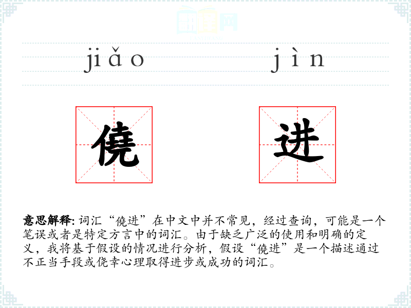 词汇“僥进”在中文中并不常见,经过查询,可能是一个笔误或者是特定方言中的词汇。由于缺乏广泛的使用和明确的定义,我将基于假设的情况进行分析,假设“僥进”是一个描述通过不正当手段或侥幸心理取得进步或成功的词汇。