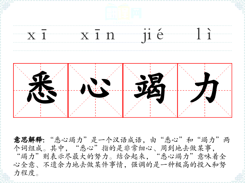 “悉心竭力”是一个汉语成语,由“悉心”和“竭力”两个词组成。其中,“悉心”指的是非常细心、周到地去做某事,“竭力”则表示尽最大的努力。结合起来,“悉心竭力”意味着全心全意、不遗余力地去做某件事情,强调的是一种极高的投入和努力程度。