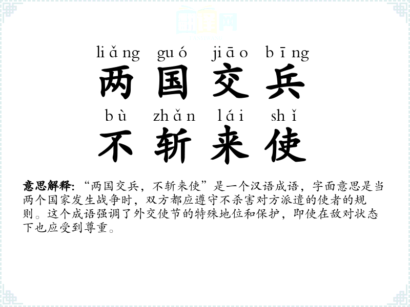 “两国交兵,不斩来使”是一个汉语成语,字面意思是当两个国家发生战争时,双方都应遵守不杀害对方派遣的使者的规则。这个成语强调了外交使节的特殊地位和保护,即使在敌对状态下也应受到尊重。