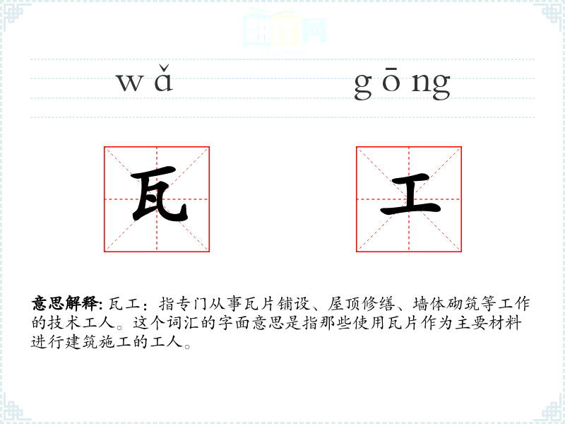 瓦工:指专门从事瓦片铺设、屋顶修缮、墙体砌筑等工作的技术工人。这个词汇的字面意思是指那些使用瓦片作为主要材料进行建筑施工的工人。