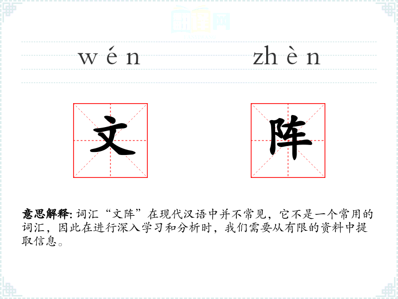 词汇“文阵”在现代汉语中并不常见,它不是一个常用的词汇,因此在进行深入学习和分析时,我们需要从有限的资料中提取信息。