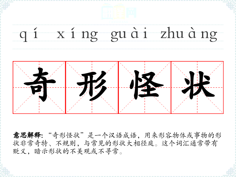 “奇形怪状”是一个汉语成语,用来形容物体或事物的形状非常奇特、不规则,与常见的形状大相径庭。这个词汇通常带有贬义,暗示形状的不美观或不寻常。