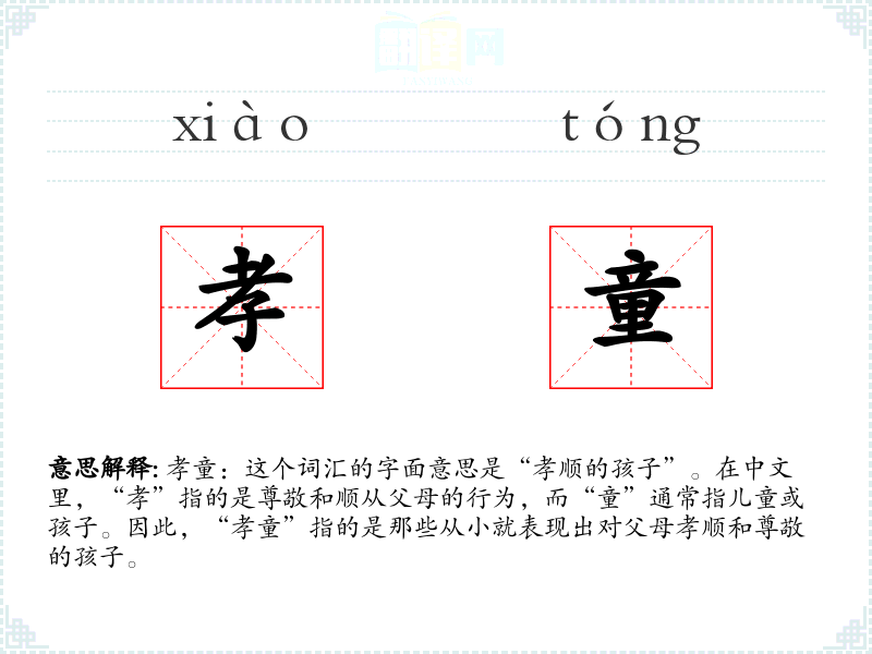 孝童:这个词汇的字面意思是“孝顺的孩子”。在中文里,“孝”指的是尊敬和顺从父母的行为,而“童”通常指儿童或孩子。因此,“孝童”指的是那些从小就表现出对父母孝顺和尊敬的孩子。