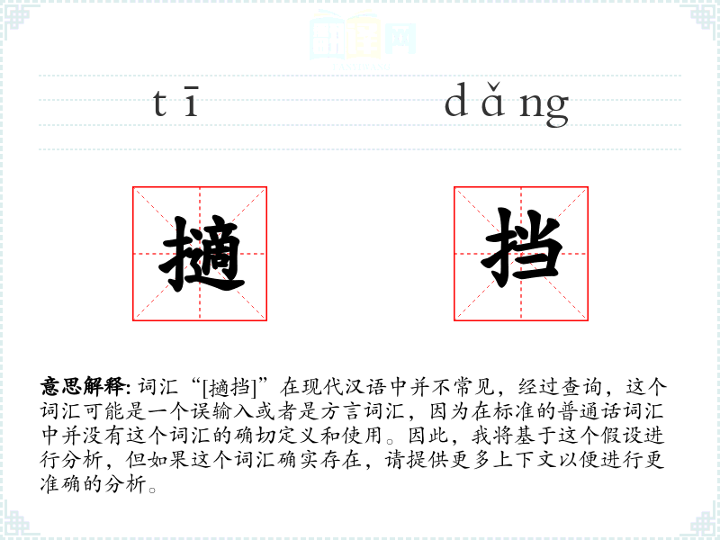 由于“[擿挡]”不是一个已知的汉语词汇,无法对其进行深入的分析和理解。在语言学习中,了解词汇的正确性和常用性是非常重要的,这有助于准确沟通和理解文化背景。如果这个词汇确实存在,请提供更多信息以便进行更准确的分析。