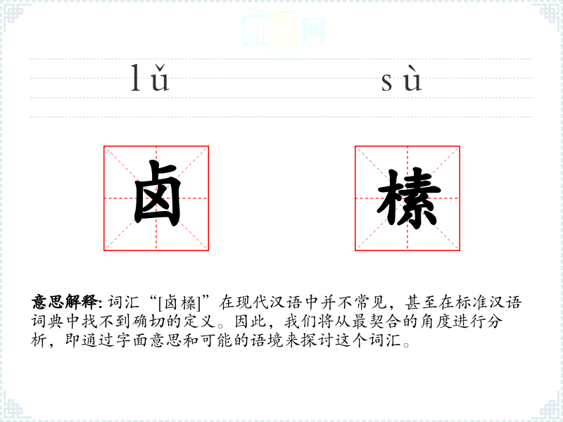 词汇“[卤槡]”在现代汉语中并不常见,甚至在标准汉语词典中找不到确切的定义。因此,我们将从最契合的角度进行分析,即通过字面意思和可能的语境来探讨这个词汇。