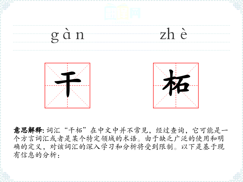 词汇“干柘”在中文中并不常见,经过查询,它可能是一个方言词汇或者是某个特定领域的术语。由于缺乏广泛的使用和明确的定义,对该词汇的深入学习和分析将受到限制。以下是基于现有信息的分析: