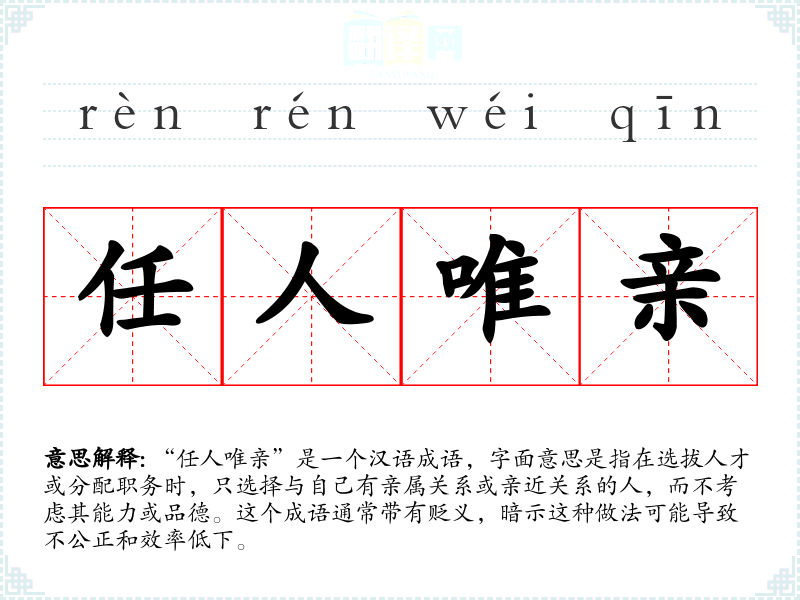 “任人唯亲”是一个汉语成语,字面意思是指在选拔人才或分配职务时,只选择与自己有亲属关系或亲近关系的人,而不考虑其能力或品德。这个成语通常带有贬义,暗示这种做法可能导致不公正和效率低下。