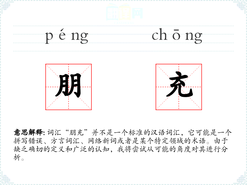 由于“朋充”不是一个标准词汇,我们无法给出确切的基本定义。如果将其拆分为“朋”和“充”两个字,我们可以分别解释: