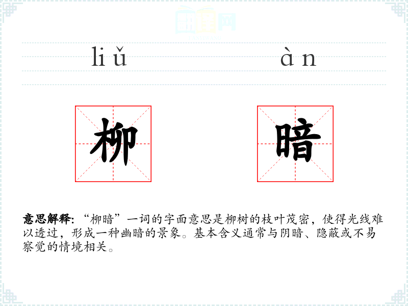 “柳暗”一词的字面意思是柳树的枝叶茂密,使得光线难以透过,形成一种幽暗的景象。基本含义通常与阴暗、隐蔽或不易察觉的情境相关。