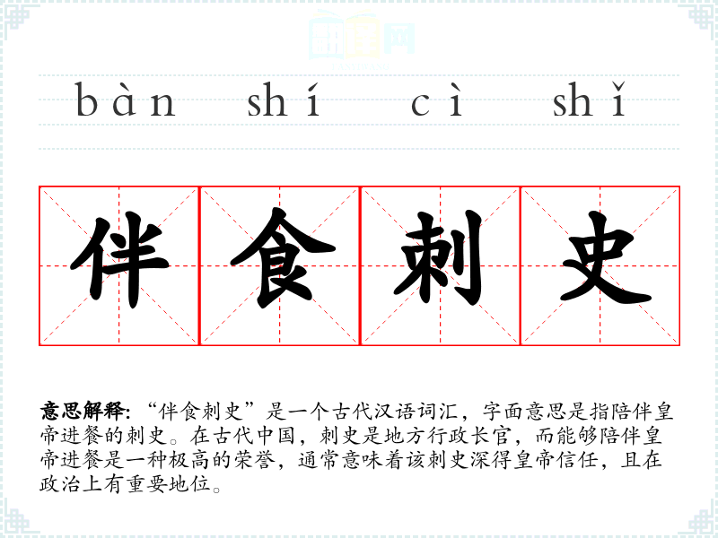 “伴食刺史”是一个古代汉语词汇,字面意思是指陪伴进餐的刺史。在古代,刺史是地方行政长官,而能够陪伴进餐是一种极高的荣誉,通常意味着该刺史深得信任,且在政治上有重要地位。