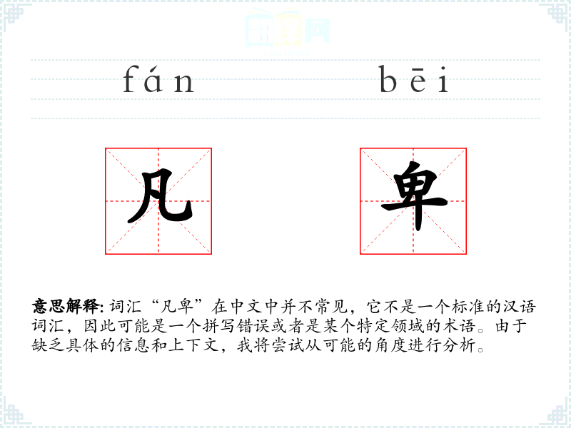 由于“凡卑”不是一个标准词汇,我们无法给出确切的基本定义。如果将其拆分为“凡”和“卑”两个字,我们可以分别解释: