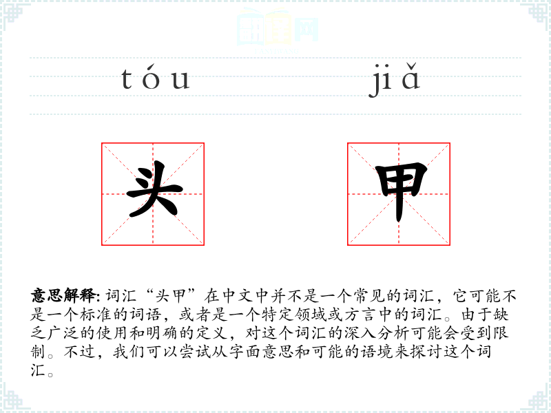 - 由于“头甲”不是一个标准词汇,其词源和演变可能不明确。它可能是由“头”和“甲”两个字组合而成的,其中“甲”在古代汉语中指盔甲或装甲。