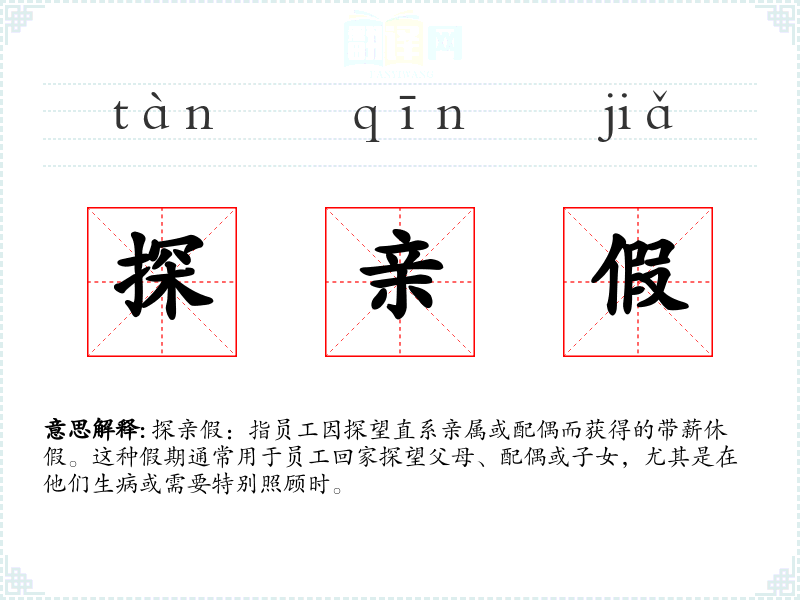- 反义词:无(探亲假是一个特定的假期类型,没有直接的反义词)