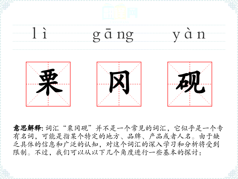 - 字面意思和基本含义:由于“栗冈砚”不是一个广为人知的词汇,我们无法提供一个确切的基本定义。它可能是由“栗冈”和“砚”两个词组成,其中“栗冈”可能是一个地名或人名,而“砚”通常指的是用于研磨墨的文房四宝之一。