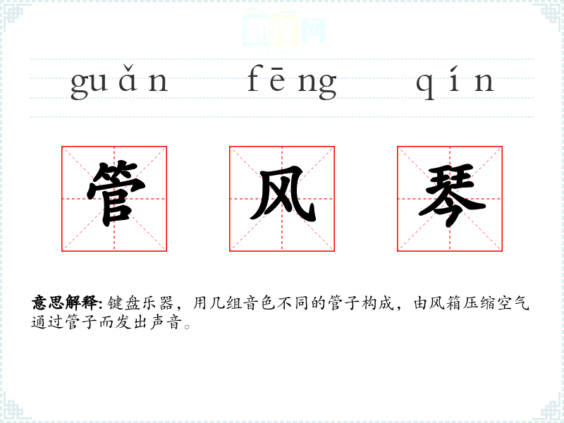 键盘乐器,用几组音色不同的管子构成,由风箱压缩空气通过管子而发出声音。