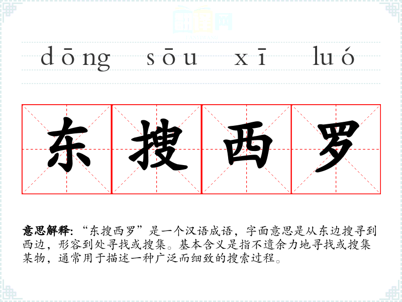 “东搜西罗”这个成语的词源较为模糊,但它体现了汉语成语中常见的对仗结构,即“东”与“西”相对,“搜”与“罗”相对。这种结构在汉语成语中很常见,用以强调动作的广泛性和彻底性。