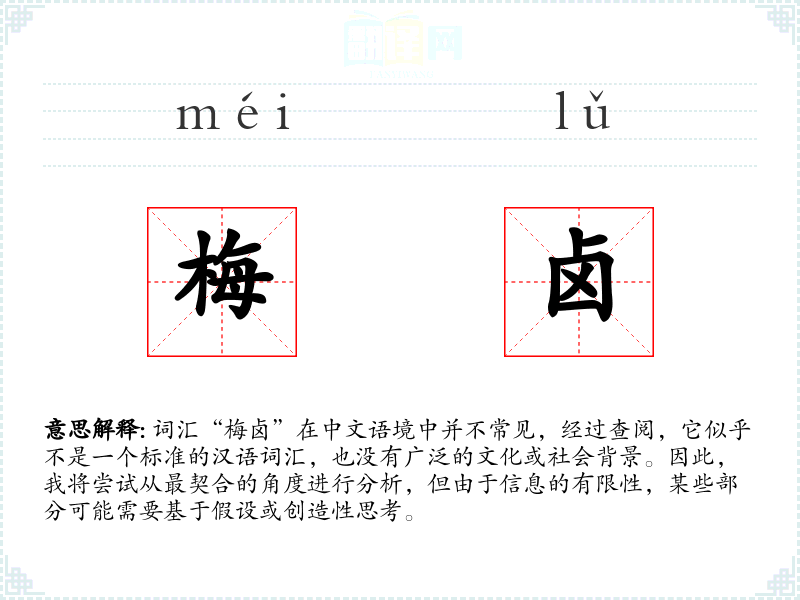 词汇“梅卤”在中文语境中并不常见,经过查阅,它似乎不是一个标准的汉语词汇,也没有广泛的文化或社会背景。因此,我将尝试从最契合的角度进行分析,但由于信息的有限性,某些部分可能需要基于假设或创造性思考。