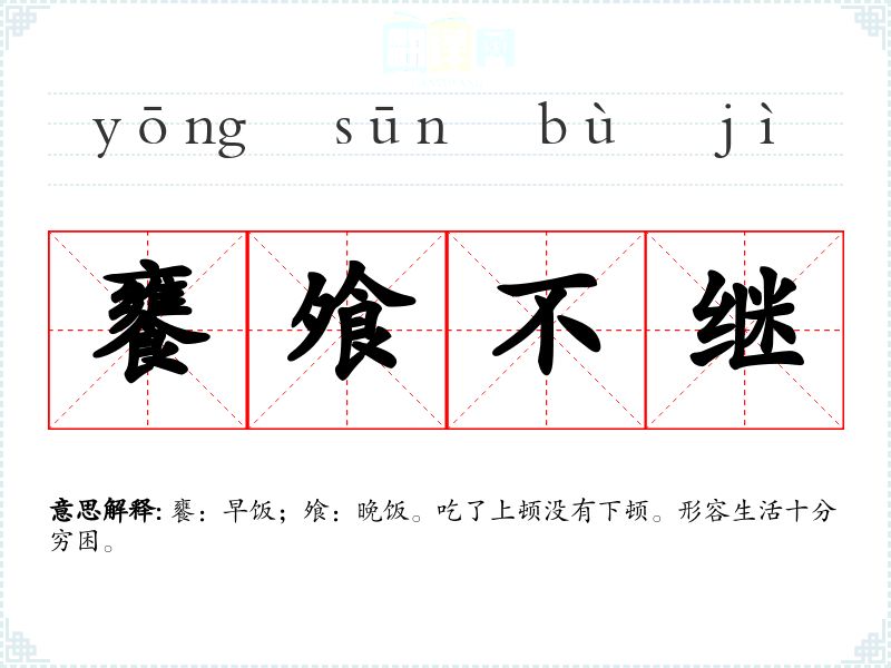 饔:早饭;飧:晚饭。吃了上顿没有下顿。形容生活十分穷困。
