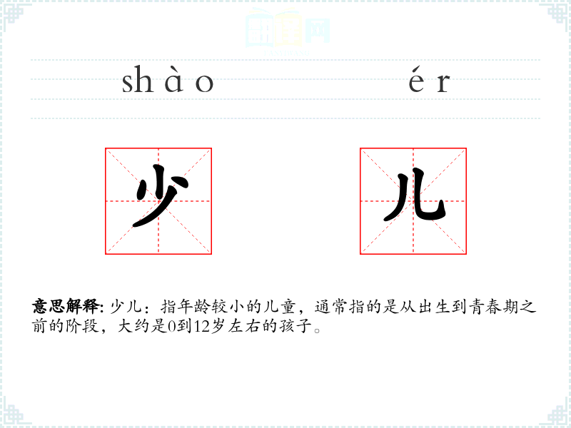 少儿:指年龄较小的儿童,通常指的是从出生到青春期之前的阶段,大约是0到12岁左右的孩子。