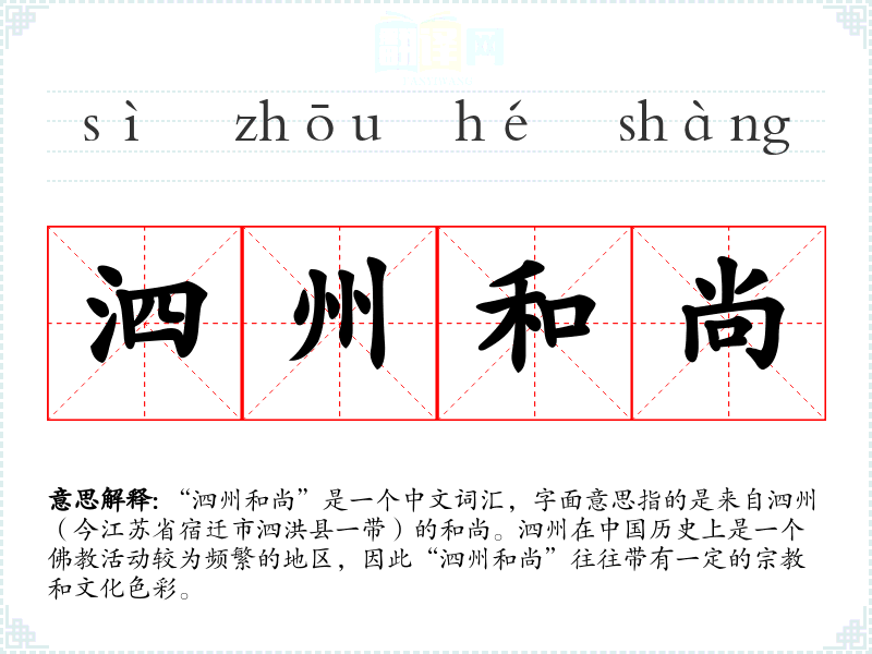 同义词:僧侣、和尚、法师 反义词:(在这个语境下,反义词可能不太适用,因为“泗州和尚”是一个特定地域和职业的结合,没有直接的反义词)