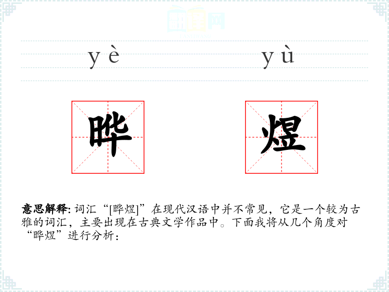 词汇“[晔煜]”在现代汉语中并不常见,它是一个较为古雅的词汇,主要出现在古典文学作品中。下面我将从几个角度对“晔煜”进行分析: