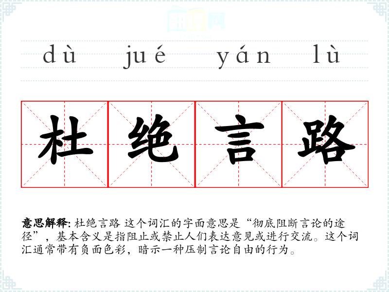 杜绝言路 这个词汇的字面意思是“彻底阻断言论的途径”,基本含义是指阻止或禁止人们表达意见或进行交流。这个词汇通常带有负面色彩,暗示一种压制****的行为。