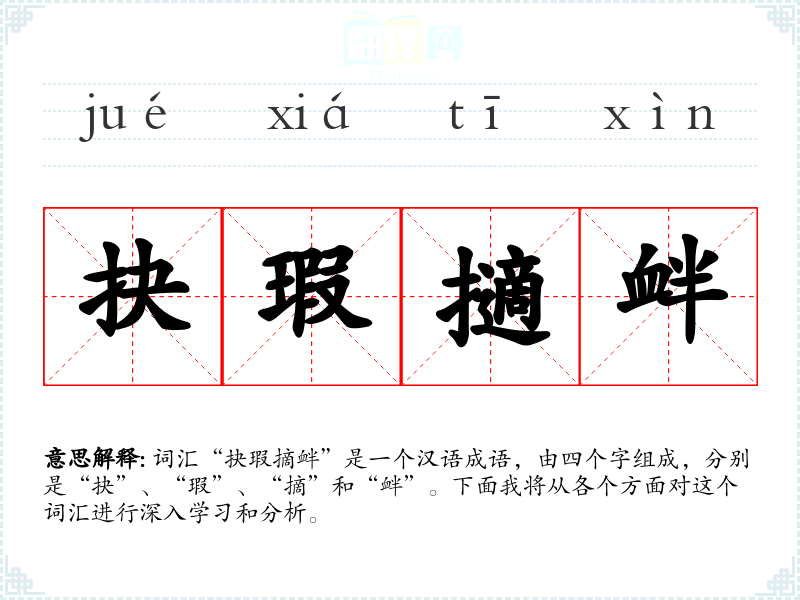 词汇“抉瑕摘衅”是一个汉语成语,由四个字组成,分别是“抉”、“瑕”、“摘”和“衅”。下面我将从各个方面对这个词汇进行深入学*和分析。