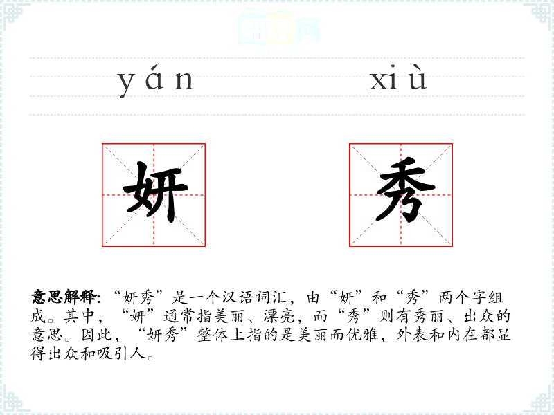 “妍”字最早见于《说文解字》,原意为美丽。“秀”字则有多种含义,包括秀丽、出众等。两个字组合成“妍秀”,在古代文献中已有使用,如《诗经》中就有“妍妍者华”的用法,后来逐渐演变成形容人或事物美丽而优雅的词汇。