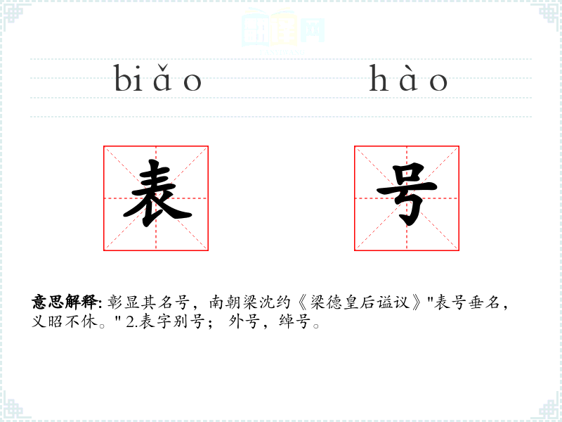 彰显其名号,南朝梁沈约《梁德皇后谥议》"表号垂名,义昭不休。" 2.表字别号; 外号,绰号。
