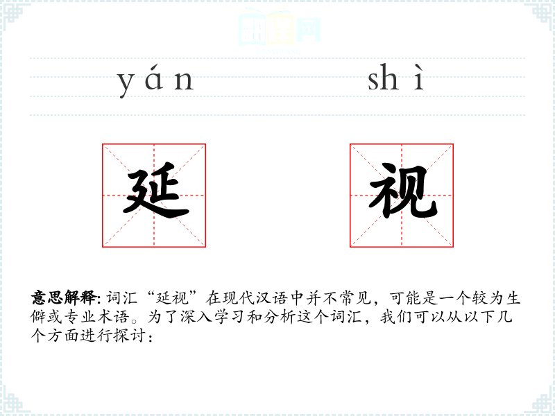 词汇“延视”在现代汉语中并不常见,可能是一个较为生僻或专业术语。为了深入学*和分析这个词汇,我们可以从以下几个方面进行探讨: