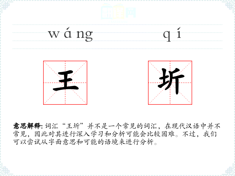 “王圻”由两个汉字组成:“王”和“圻”。“王”通常指的是君主或国王,而“圻”在古代汉语中指的是国界或边界。因此,“王圻”字面意思可能是指国王的边界或国界。