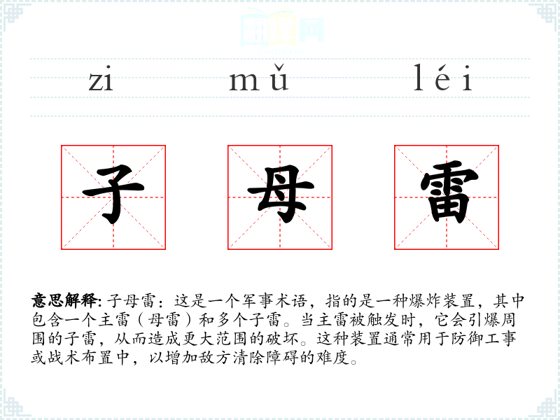 文学:在文学作品中,“子母雷”可能被用作比喻,象征着连锁反应或复杂的关系网络。 口语:在日常对话中,这个词汇不太常见,除非是在军事爱好者或专业人士之间的讨论中。 专业领域:在军事工程、战术规划和战争史研究中,“子母雷”是一个重要的专业术语。