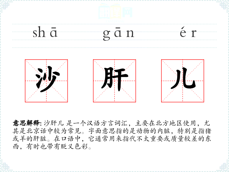 沙肝儿 是一个汉语方言词汇,主要在北方地区使用,尤其是北京话中较为常见。字面意思指的是动物的内脏,特别是指猪或羊的肝脏。在口语中,它通常用来指代不太重要或质量较差的东西,有时也带有贬义色彩。