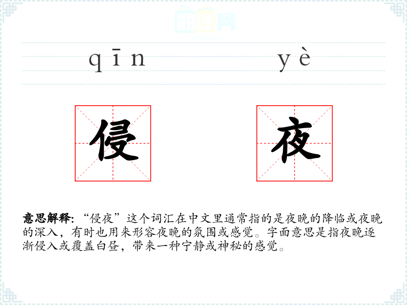 “侵夜”这个词汇的词源较为直接,由“侵”和“夜”两个字组成。在古代汉语中,“侵”有逐渐进入或覆盖的意思,而“夜”自然指的是夜晚。随着时间的推移,这个词汇的使用逐渐固定下来,主要用来描述夜晚的到来或夜晚的氛围。