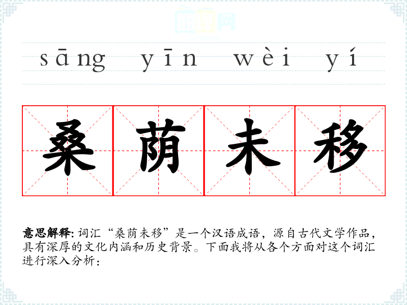 词汇“桑荫未移”是一个汉语成语,源自古代文学作品,具有深厚的文化内涵和历史背景。下面我将从各个方面对这个词汇进行深入分析: