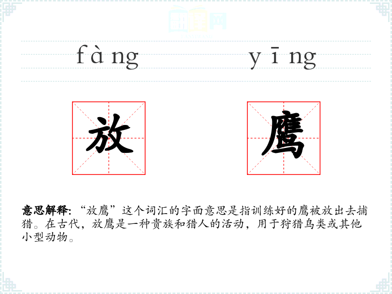 “放鹰”这个词汇的字面意思是指训练好的鹰被放出去捕猎。在古代,放鹰是一种贵族和猎人的活动,用于狩猎鸟类或其他小型动物。