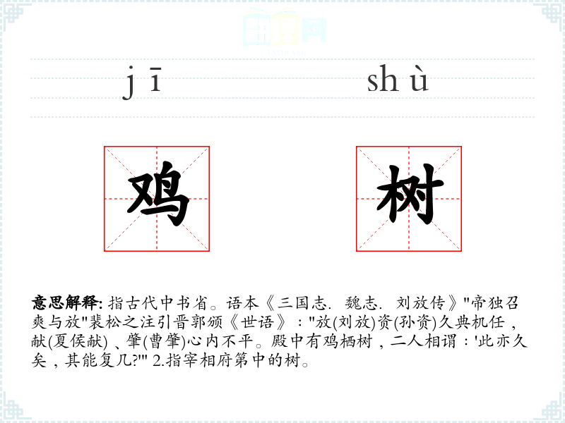 1.指古代中书省。语本《三国志.魏志.刘放传》"帝独召爽与放"裴松之注引晋郭颁《世语》﹕"放(刘放)资(孙资)久典机任﹐献(夏侯献)﹑肇(曹肇)心内不平。殿中有鸡栖树﹐二人相谓﹕'此亦久矣﹐其能复几?'" 2.指宰相府第中的树。